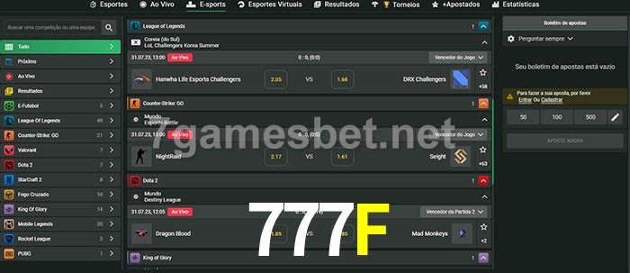 O 777F oferece uma grande seleção de opções de apostas em e-sports com probabilidades competitivas